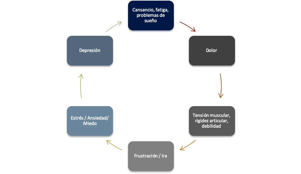 Hoy sabemos que estas consecuencias habituales del dolor contribuyen a cronificarlo. También sabemos que las distintas dimensiones psicológicas implicadas en el dolor interactúan entre ellas, retroalimentándose en distintas direcciones, y conformando una cadena que contribuye al mantenimiento y cronificación del dolor: Cansancio, fatiga, problemas de sueño / Dolor / Tensión muscular, rigidez articular, debilidad / Frustración, ira / Estrés, ansiedad, miedo / Depresión… Fíjate en el esquema, ¿te suena?